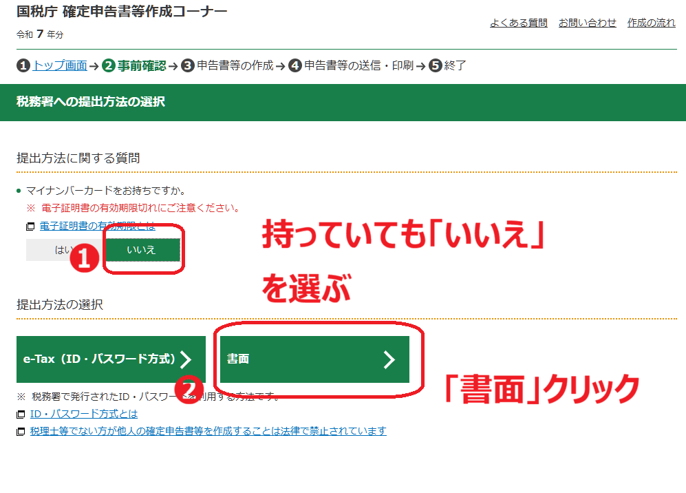 マイナンバーカードを持っているを選ぶと「書面」が出てきません。