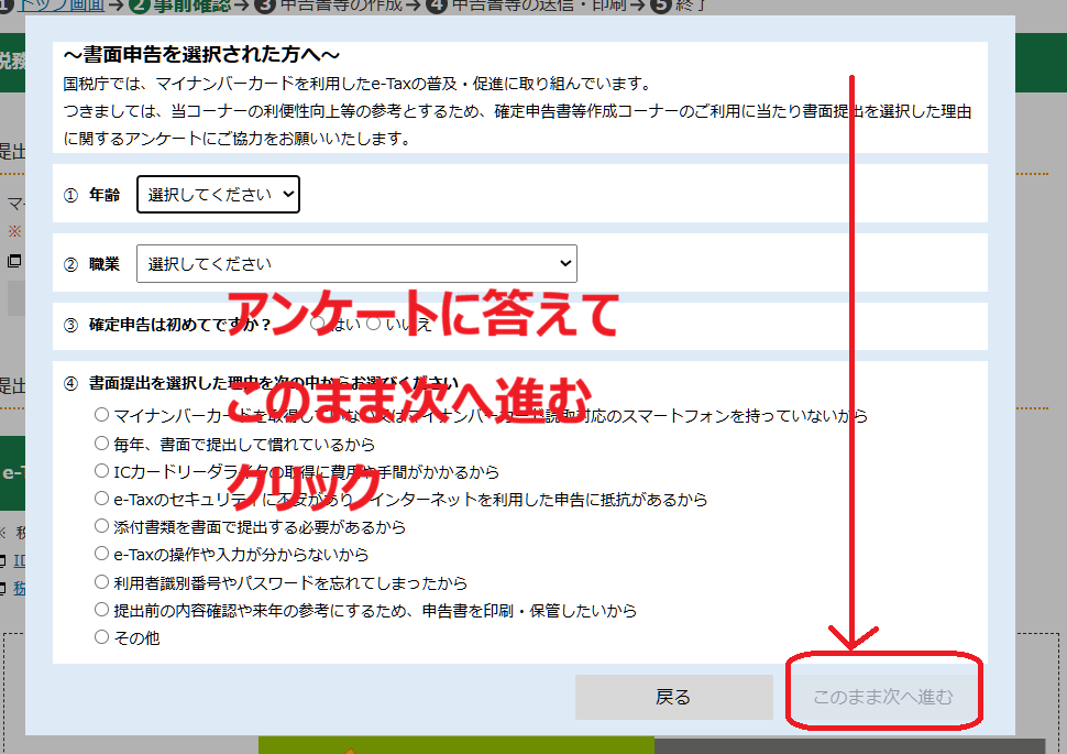 アンケートに答えなければ「このまま次へ進む」がクリックできません。